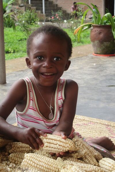 Manchmal passiert es, dass sich der in den Säcken gelagerter Mais Insekten einnisten. Die zersetzen den Mais. Dann muss der Mais ganz schnell aus den Säcken geholt werden und gesiebt werden. Dann sehen alle Kinder ganz lustig aus, weil sie voller Maismehl sind, dass die Insekten gemacht haben.