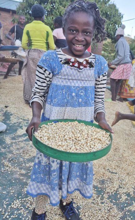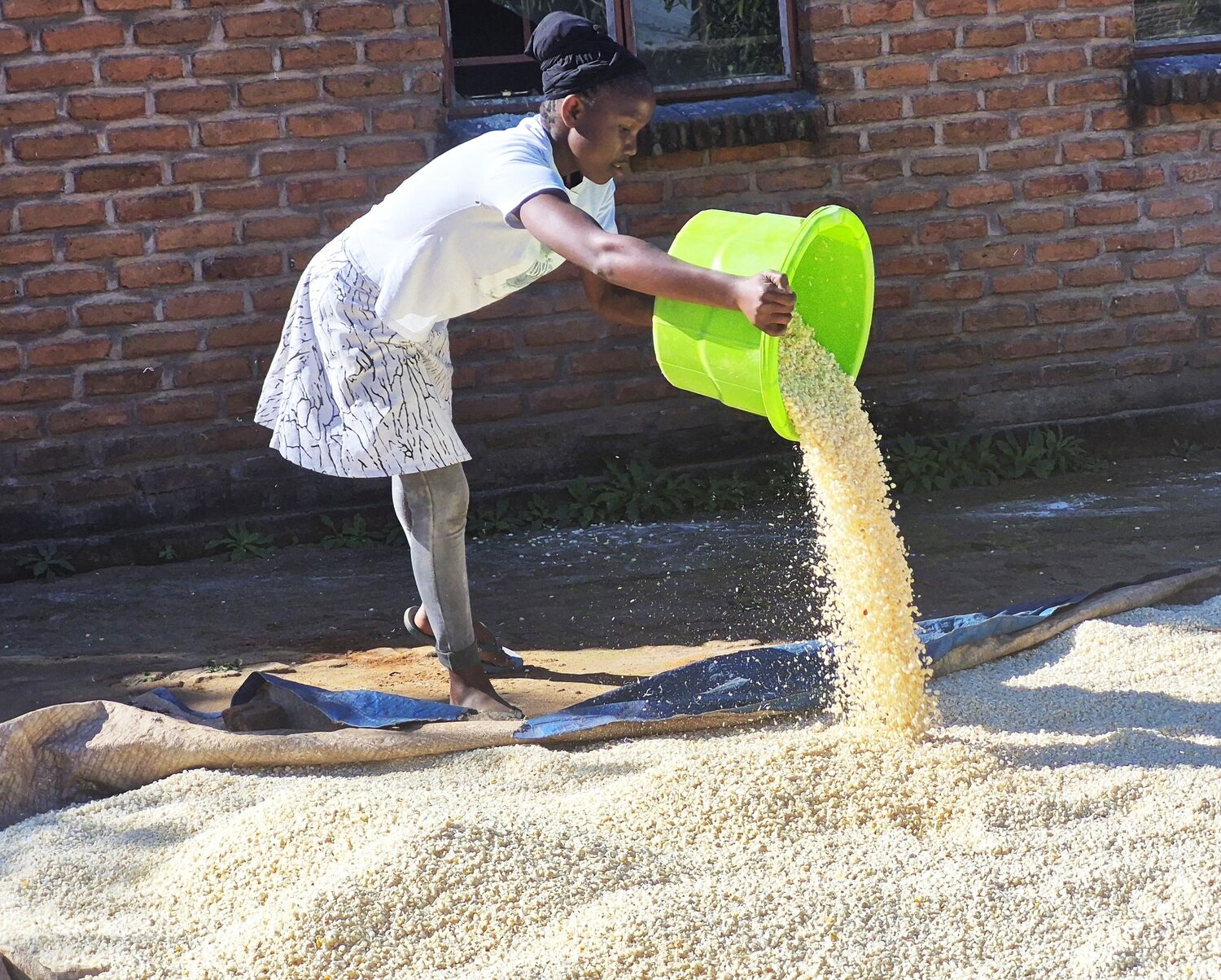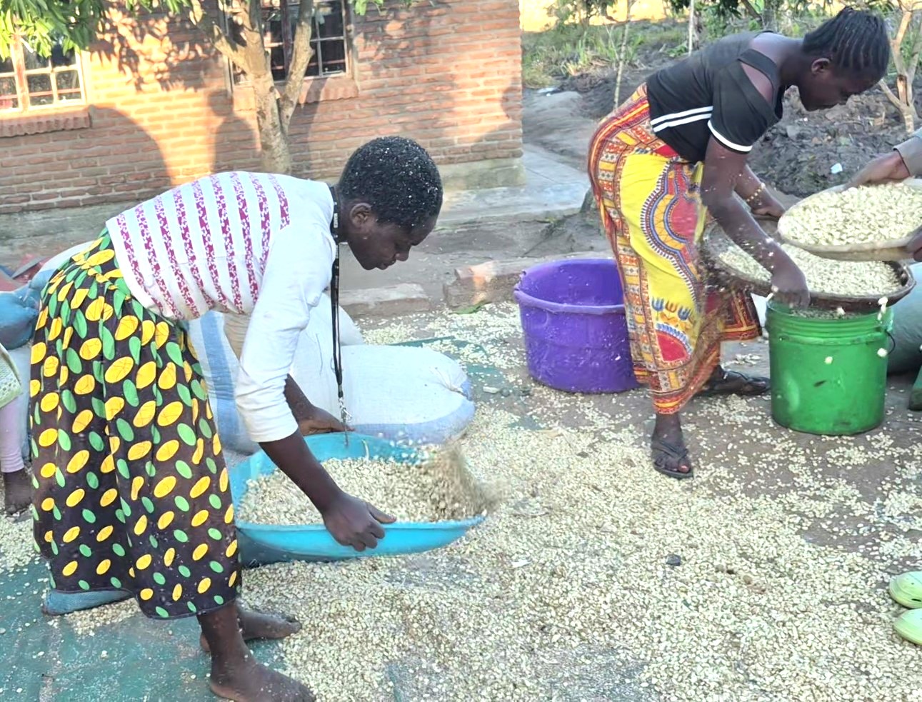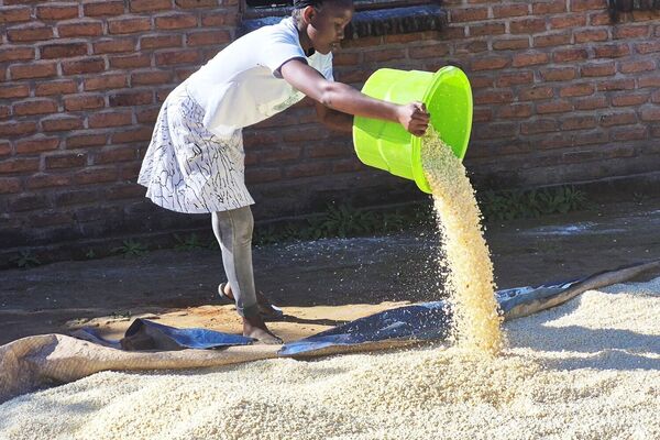 Die Trocknung der Körner dauert mehrere Tage, wenn nicht sogar Wochen, da es dafür warm genug sein und natürlich trocken sein muss. Die Erntezeit liegt aber am Ende der Regenzeit. In großen Eimern werden die Körner auf dem Kopf transportiert und auf großen Planen ausgelegt. Video