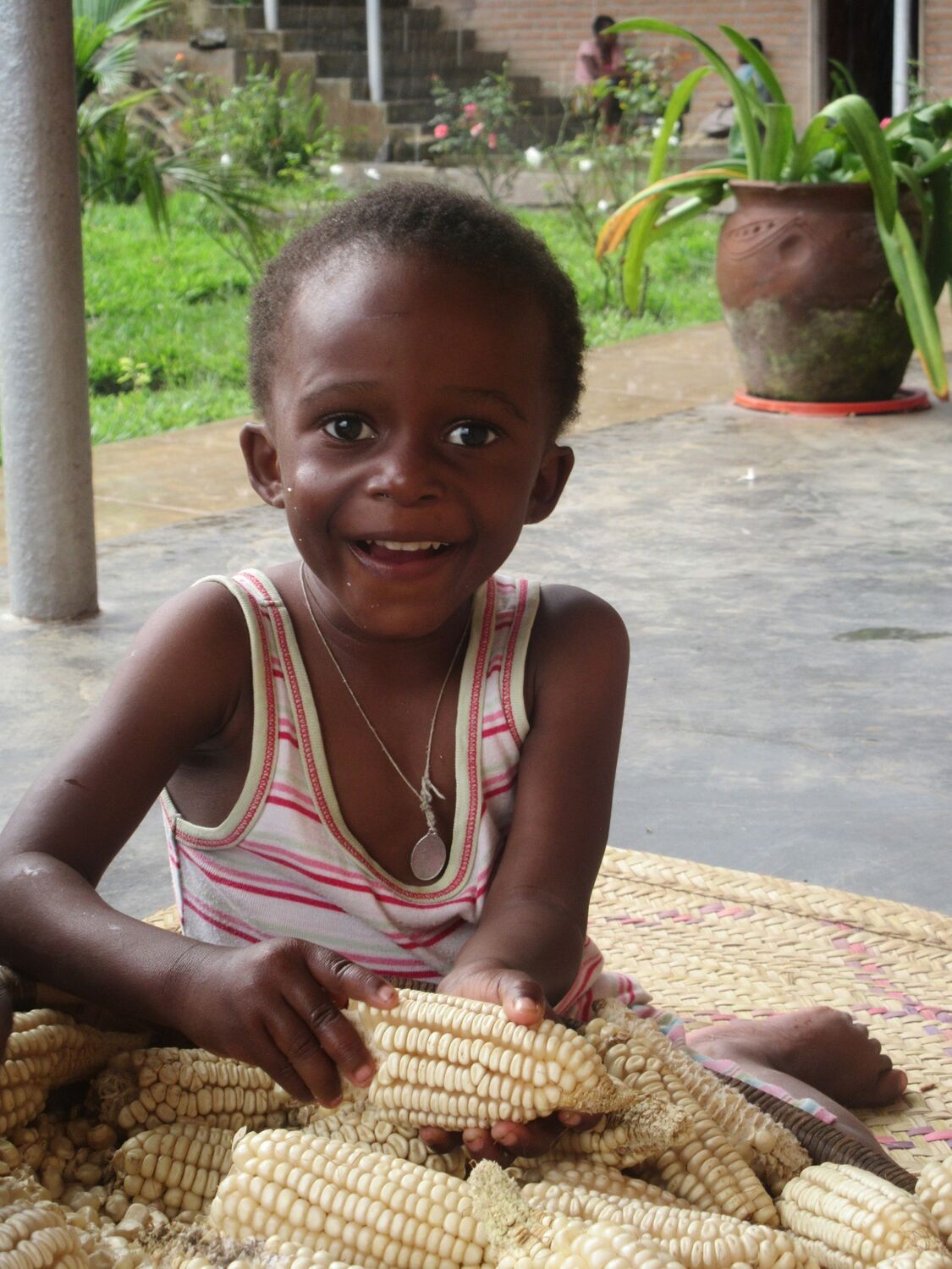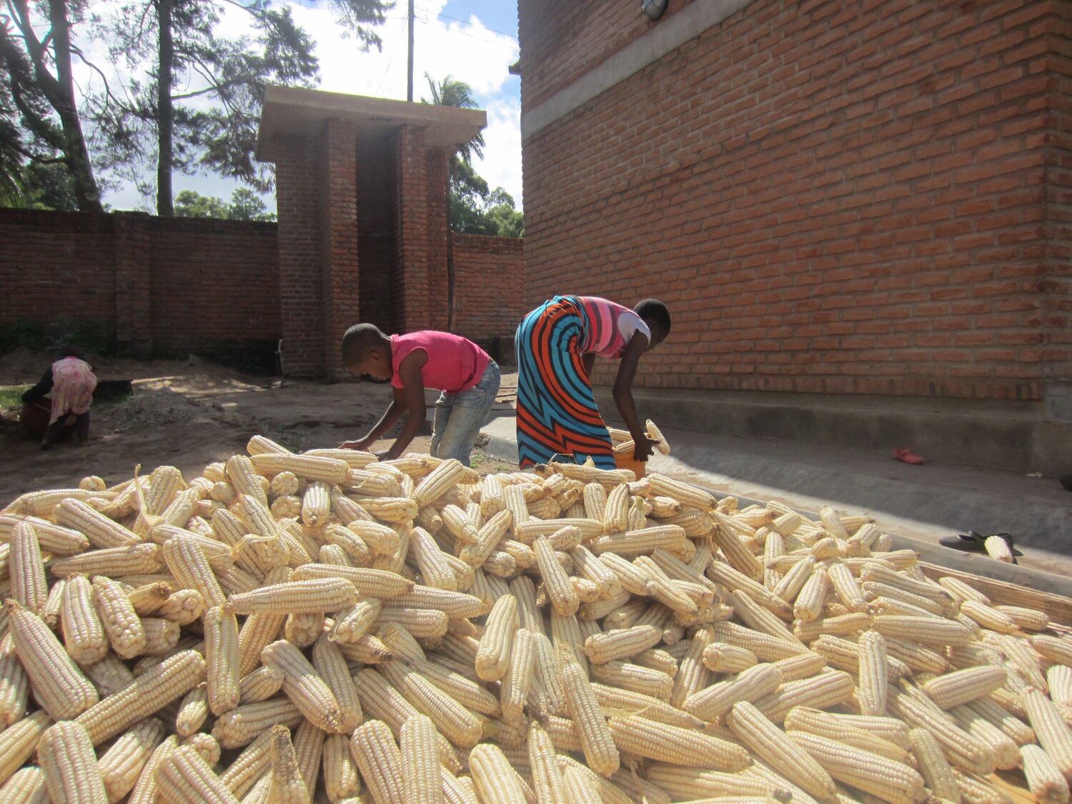 Der Mais wird nicht wie hier in Deutschland mit Maschinen geerntet, sondern muss einzeln vom Maisstiel abgepflückt werden. Auch beim Pflücken helfen alle Kinder mit. Danach müssen die Maiskolben erst einmal getrocknet werden. Dafür werden sie in die Sonne gelegt. Das dauert mehrere Tage. Die getrockneten Maiskolben werden dann abgepuhlt, heißt die einzelnen Körner müssen vom inneren Maiskolben abgelöst werden. Das ist richtig schwer. Ich habe es selbst probiert und mir dabei Blasen an den Fingern geholt. Aber hier können das schön die Kleinsten.
