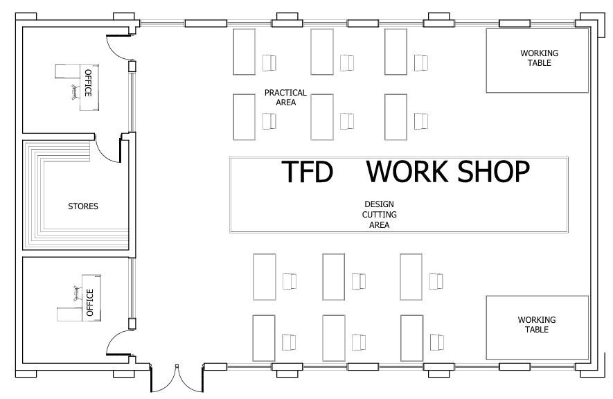 - Im Zentrum des Workshops befindet sich ein großer, langer Tisch zum Begutachten der Stoffe und Zuschnitt.