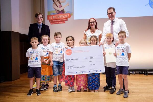 „Das ist richtig cool“, freute sich der zehnjährige David darüber, dass er und die anderen Viertklässler beim Bundeswettbewerb „Blaues Wunder“ des Vereins Behinderung und Entwicklungszusammenarbeit (bezev) gewonnen haben. Sie hatten ein Bilderbuch gemalt und geschrieben, in dem es um einen Wassertropfen geht, der vom afrikanischen Staat Malawi nach Deutschland und wieder zurück reist. „Wir wollten die Unterschiede im Umgang mit Wasser in beiden Ländern darstellen“, erklärte Fahed (10).